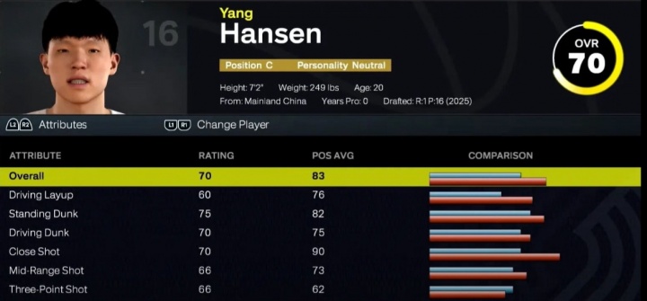 08月26日讯 杨瀚森在《NBA 2K26》中的一系列具体数值出炉。